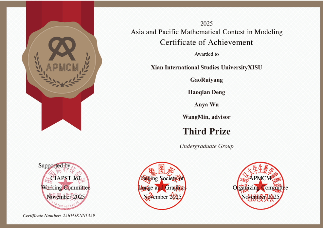 近日,2025年第15届APMCM亚太地区大学生数学建模竞赛(Asia and Pacific Mathematical Contest in Modeling)获奖名单正式揭晓。经过数月的精心筹备与四天三夜的紧张赛事,我校学子凭借扎实的学科功底与卓越的团队协作能力脱颖而出。